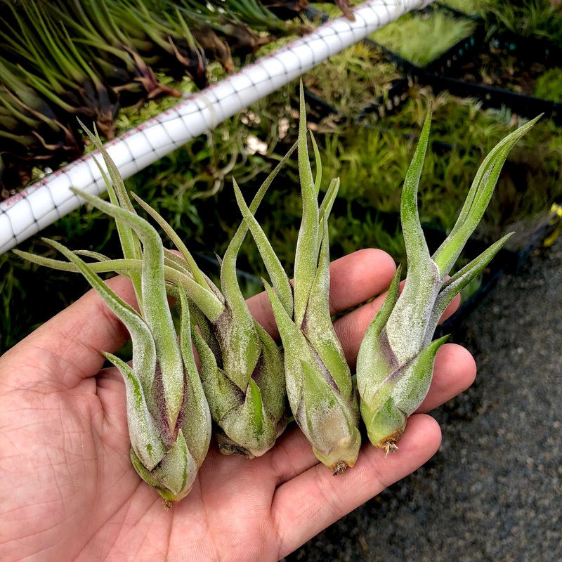 Caput, meaning “head” and Medusae, meaning “of Madusa” refers to this air plant’s whimsical, firm leaf blades. The Caput Medusae is a stemless plant that can tolerate a bit more light than its Bulbosa and Butzii cousins. It is a true “beginner air plant” in the sense that it can withstand a variety of conditions and still thrive. It does have its preferences though. Generous amounts of bright filtered light, routine watering, and thorough drying between watering days will give you a nice, green plant that rewards you with new offsets.